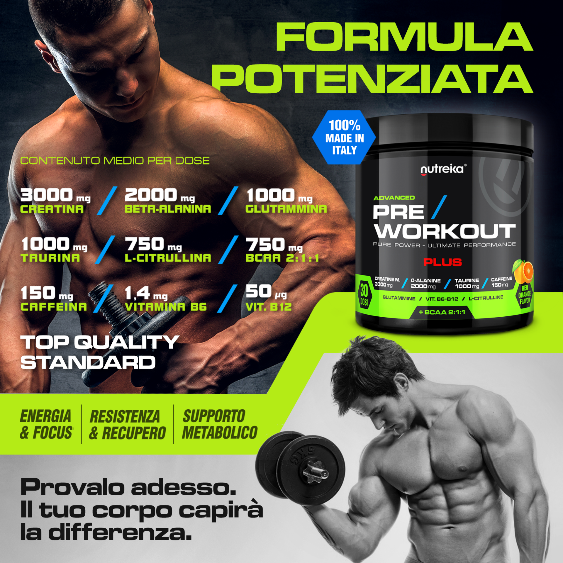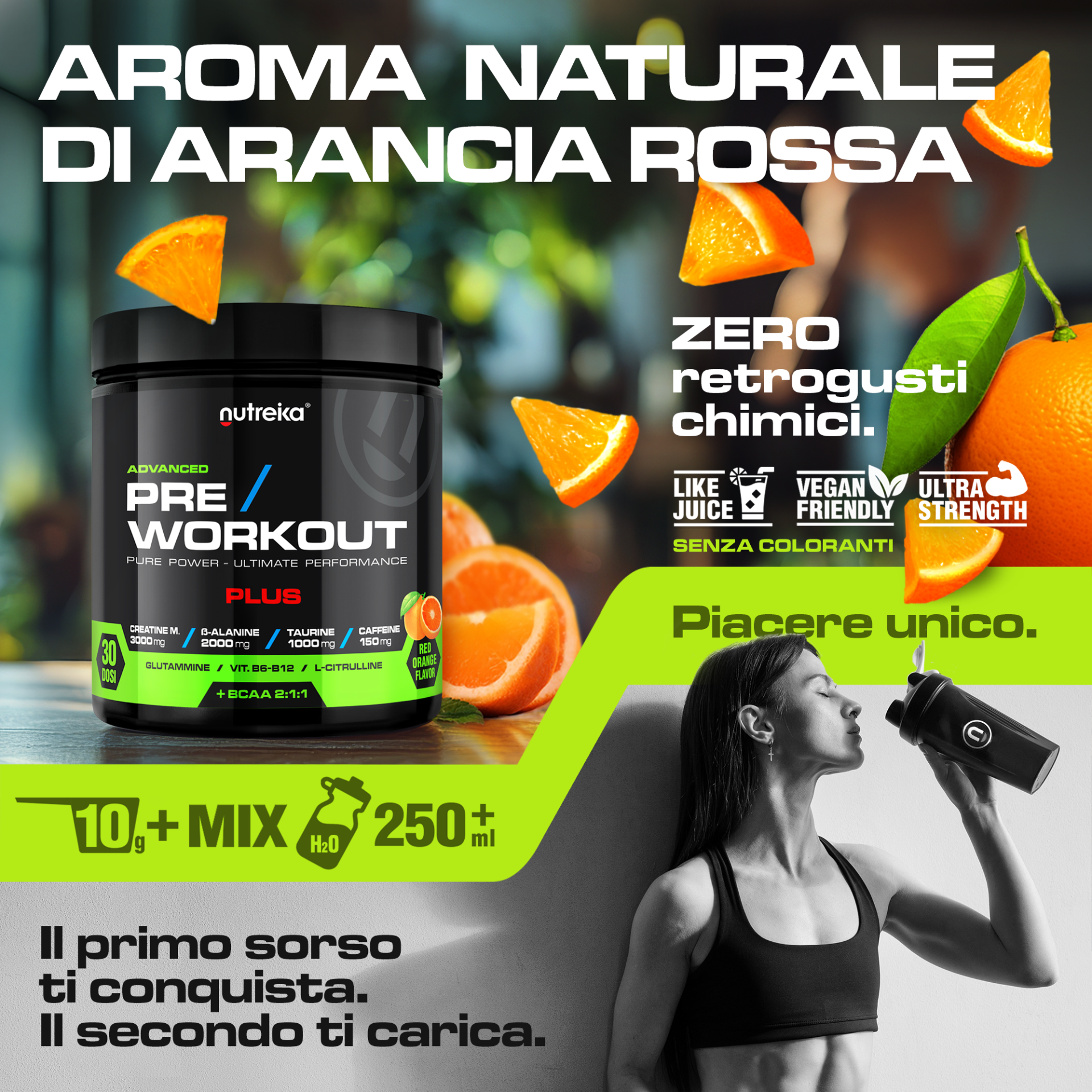 Nutreika Advanced Pre-Workout PLUS è un integratore alimentare in polvere, al fresco e dissetante gusto di arancia rossa (zero retrogusti chimici), progettato per fornire energia, concentrazione e resistenza durante l'attività fisica.